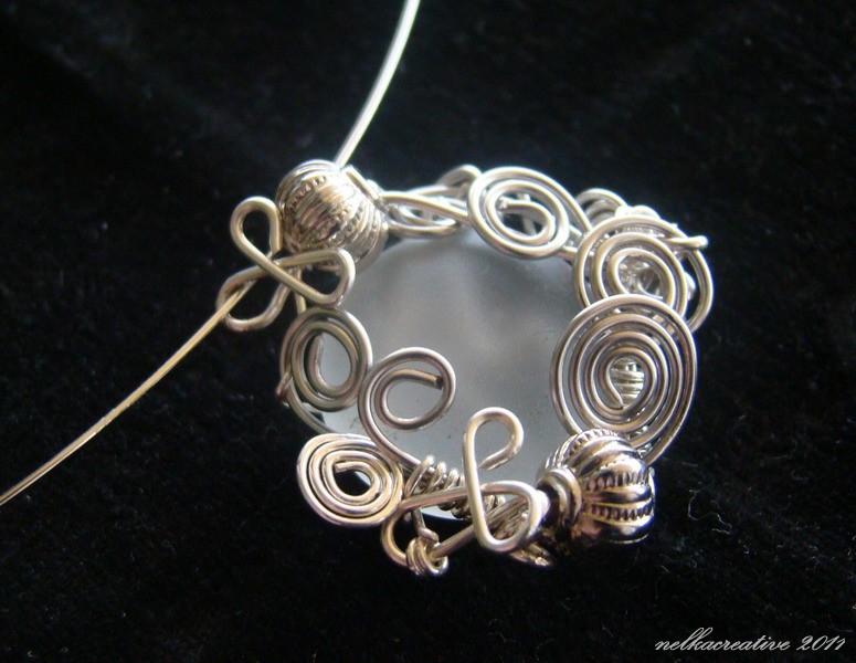 Nahrdelnik je zdobeny polopriehladnym sklenenym kamienkom, so satenovym povrchom, s farbou hustej rannej hmly. Drotovane sperkarskym drotom striebornej farby.Doplnene koralkami v striebornej farbe. Priemer privesku je 3,5cm. Zavesene na kov.obruci s priemerom 15cm.